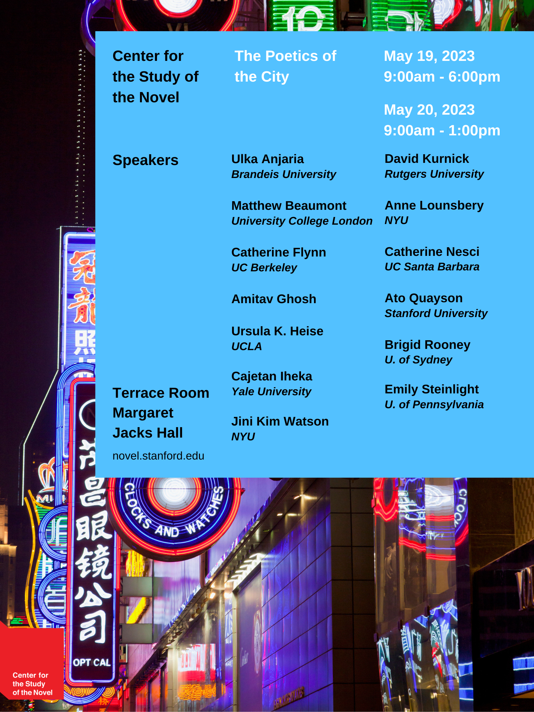 Participants: Ulka Anjaria, Matthew Beaumont, Catherine Flynn, Amitav Ghosh, Ursula Heise, Cajetan Iheka, David Kurnick, Anne Lounsbery, Catherine Nesci, Ato Quayson, Brigid Rooney, Emily Steinlight